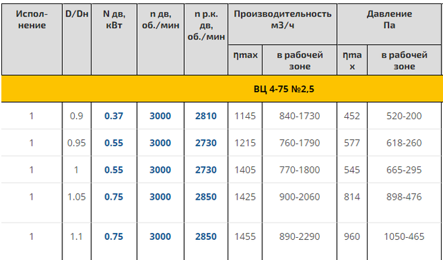 | ВЦ 4-75 №2,5 | 760-2290 | 200-1050 | 0,37-0,75 | 3000 |
